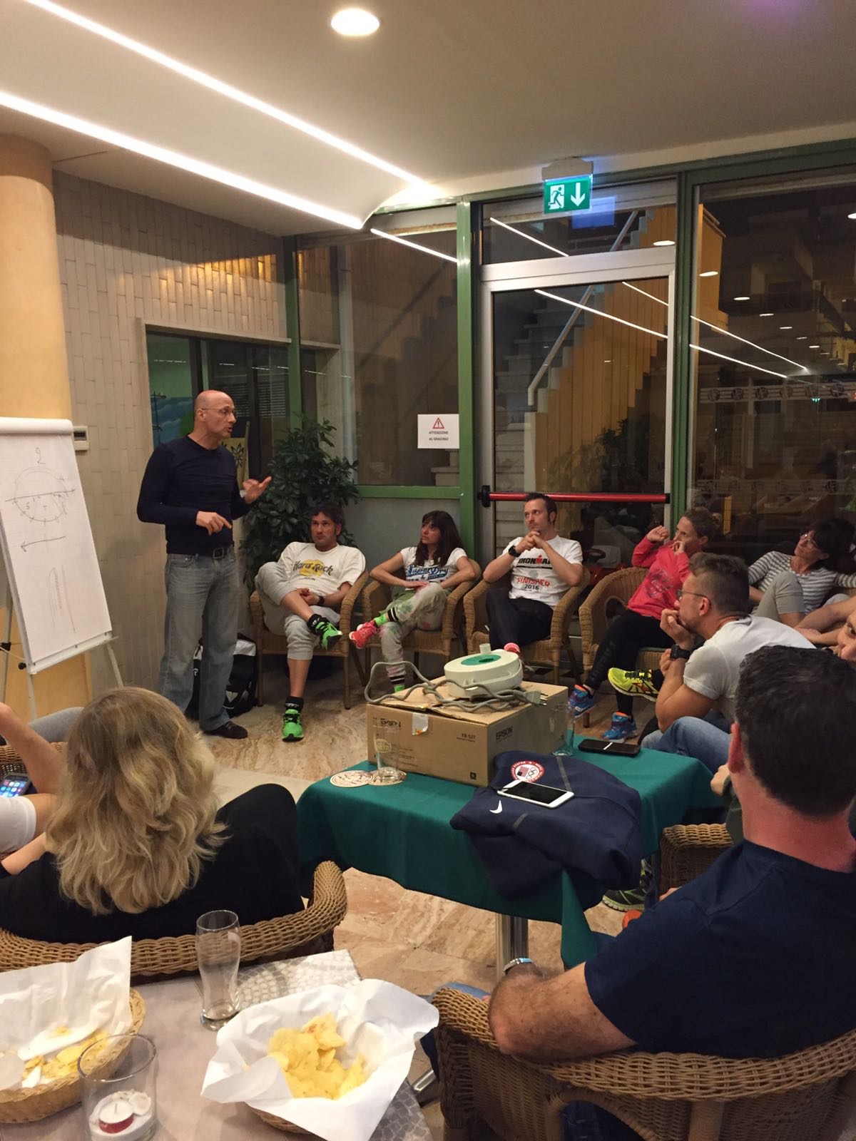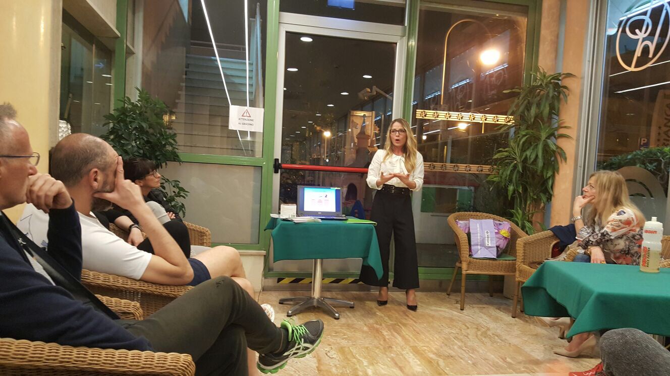 Prima di cena finalmente la lezione teorica di nuoto del coach. Fedeli al motto, “prima si pecca, poi si espia“, dopo cena la nutrizionista Serena Moretti ci ha illustrato come alimentarci e come affrontare lo sforzo fisico senza debilitarci.
